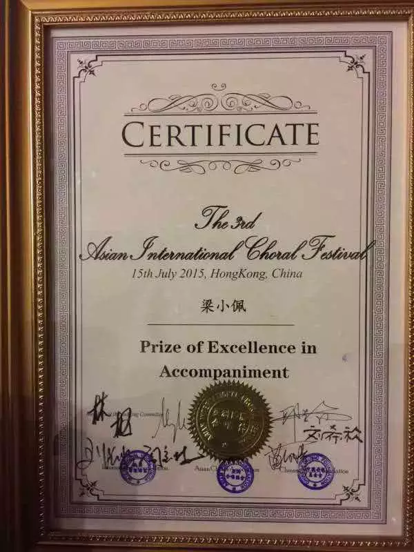 2015年7月15日,叶高峰合唱名家工作室率领的温岭市三星少儿合唱团、温岭市教师合唱团,参加香港第三届亚洲国际合唱节,分别荣获少儿组金奖,重唱组金奖,梁小佩老师荣获优秀钢琴伴奏奖。