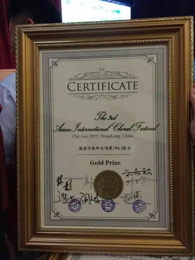 温岭市教师合唱团金奖证书